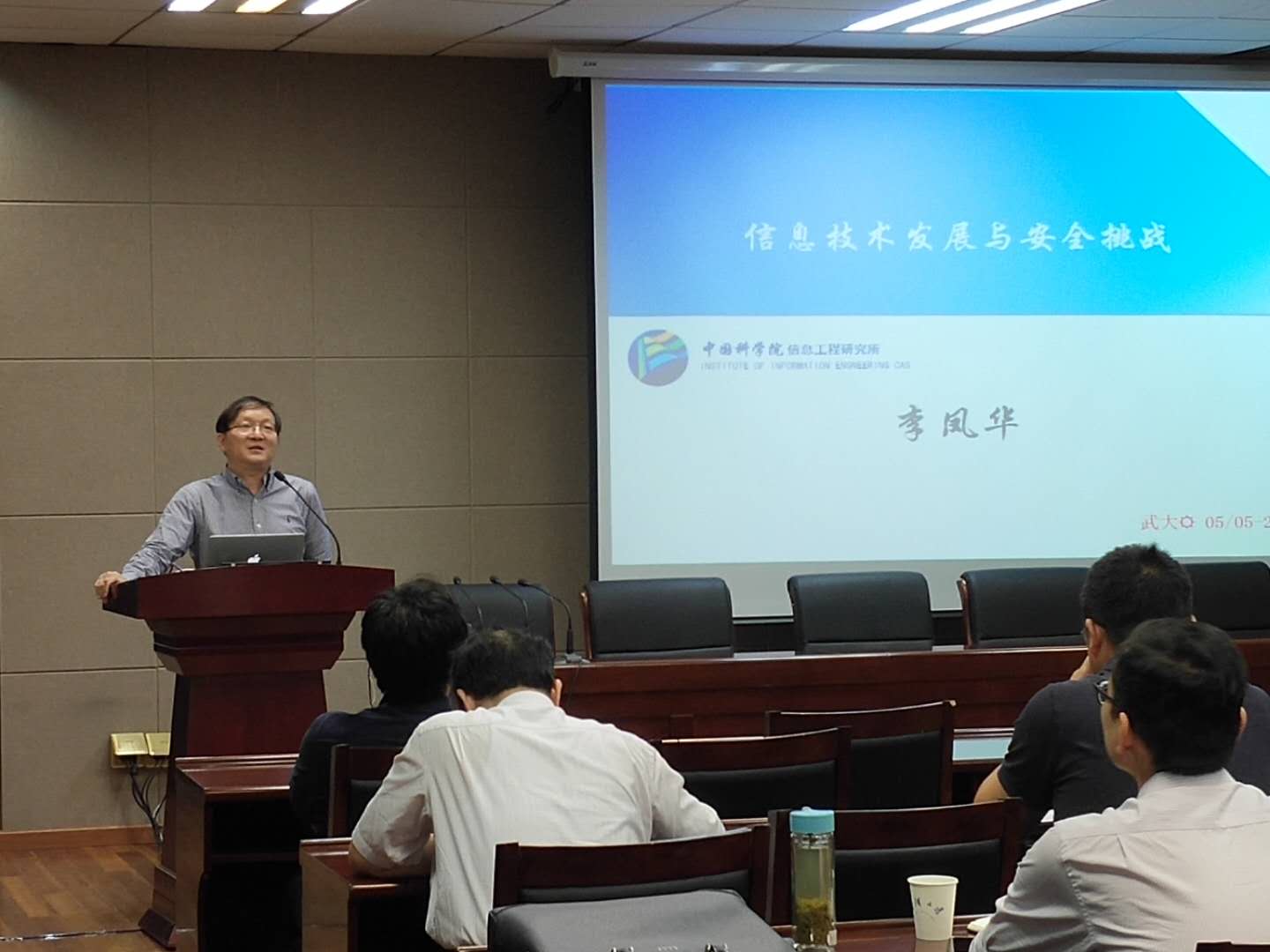 5月6日上午,学院在五楼报告厅举办2018年度“网络空间安全杰出科学家论坛”,邀请西安电子科技大学马建峰教授、深圳大学黄继武教授、中科院信息工程研究所李凤华研究员以及西安电子科技大学网络与信息安全学院执行院长李晖教授四位杰出科学家来院做精彩报告。学院党委书记沃闻达参加了论坛,论坛由副院长赵波教授、王骞教授主持。