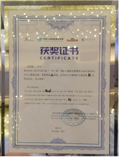 本届大数据竞赛由教育部高等学校大学计算机课程教学指导委员会及丝绸之路大学联盟指导,由联合国教科文组织国际工程科技知识中心(IKCEST)、中国工程科技知识中心(CKCEST)、百度公司及西安交通大学共同主办。大赛吸引了共建“一带一路”国家和地区的高校、科研院所、企业的4147名选手,3809支队伍参赛,其中有89所海外院校,覆盖19个国家和地区。16支队伍经过初赛、复赛环节的角逐进入总决赛,我校队伍排名第十。