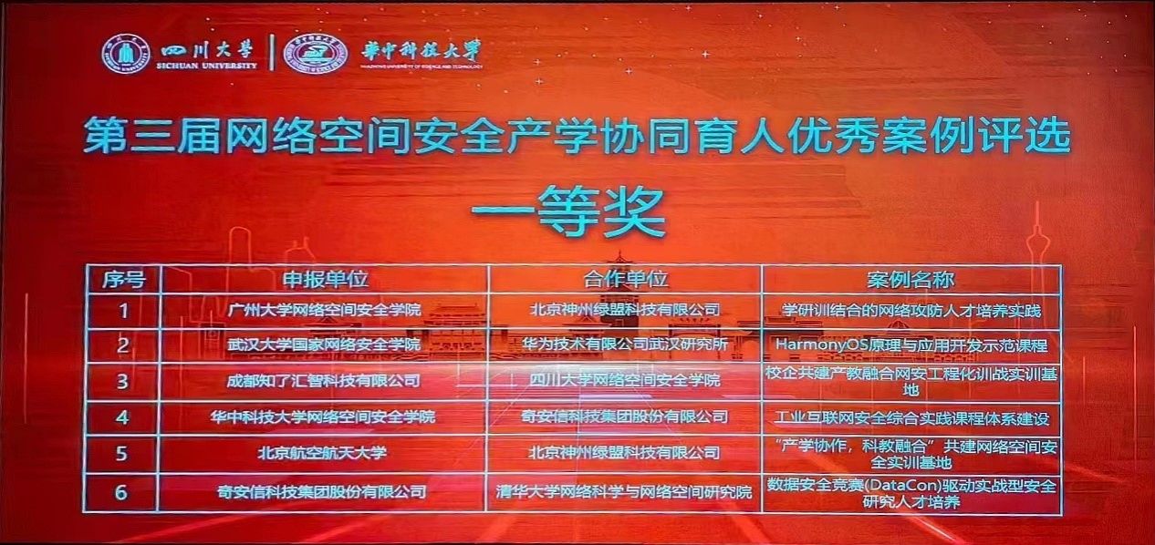 (实验教学中心 杜秋平 熊翘楚)2023年7月6日,由教育部高等学校网络空间安全专业教学指导委员会产学合作育人工作组主办、四川大学与华中科技大学共同承办的“第三届网络空间安全产学协同育人优秀案例评选会”在四川成都召开线下评审会,我院共获得一等奖1项,二等奖2项,三等奖2项。
